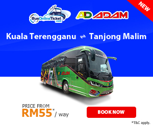 Check out the Adam Express bus ticket availability between Kuala Terengganu and Tanjong Malim now at BusOnlineTicket.com. Due to the limited seat availability, you are recommended to book your bus ticket in advance especially for trips on weekends and holiday seasons. Instant confirmation email will be sent to you once the payment is successful.