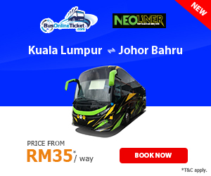 Book your bus tickets with BusOnlineTicket.com and travel between Kuala Lumpur and Johor Bahru with Neoliner Express today! BusOnlineTicket.com accepts credit card, internet banking, Paypal, Alipay and many more payment options which makes online booking easier for everyone. Confirmation of ticket is instant in BusOnlineTicket.com.